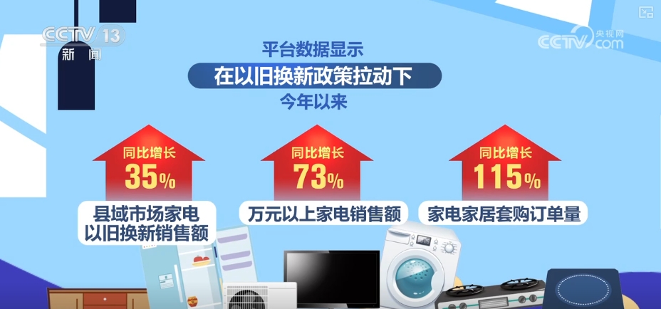 平臺(tái)數(shù)據(jù)顯示,在“以舊換新”政策拉動(dòng)下,2025年以來(lái),縣域市場(chǎng)家電“以舊換新”銷(xiāo)售額同比增長(zhǎng)35%,萬(wàn)元以上家電銷(xiāo)售額同比增長(zhǎng)73%,家電家居套購(gòu)訂單量同比增長(zhǎng)115%。