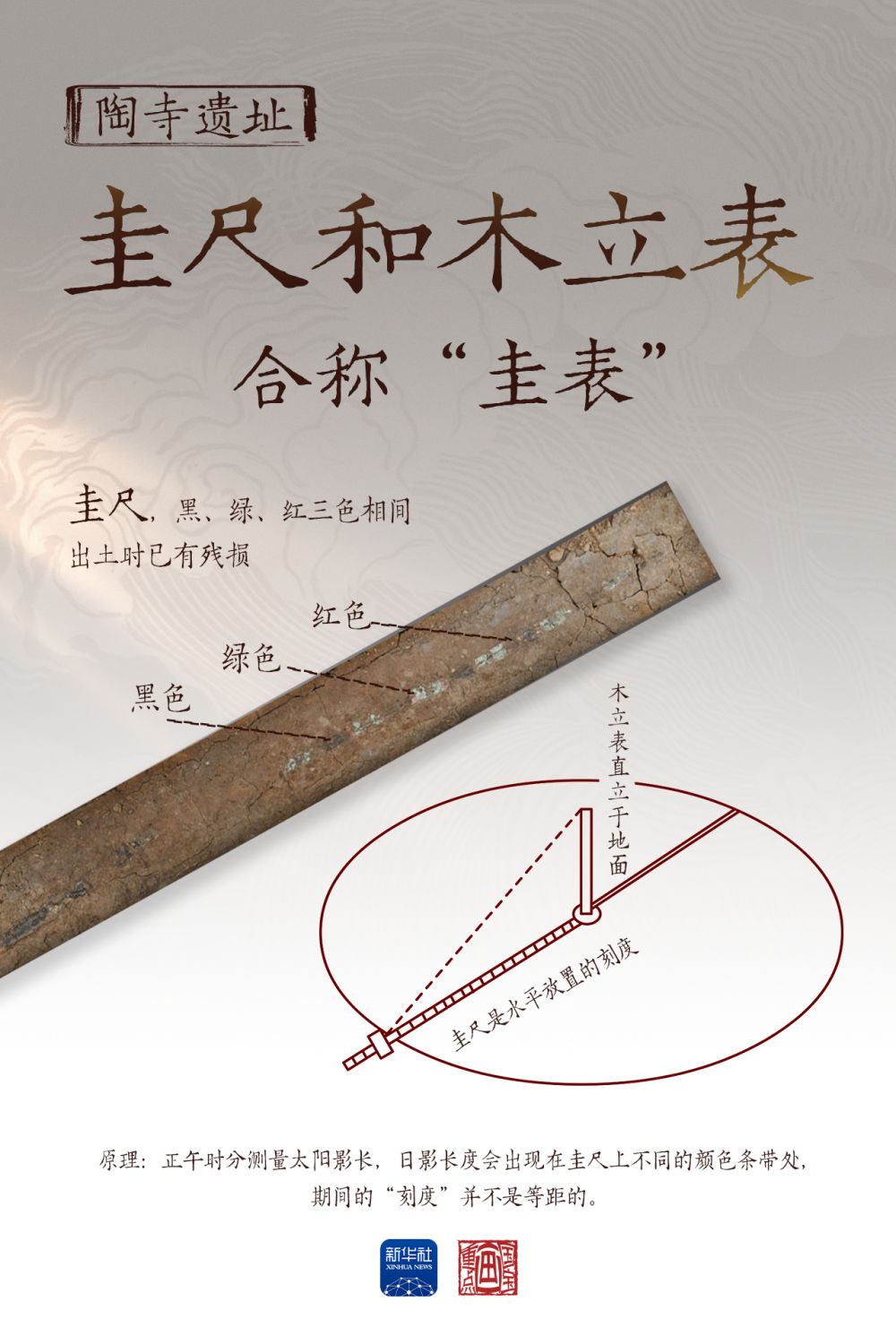 圭尺和木立表,是陶寺遺址出土的另外一件觀天象、授人時的文物,合稱“圭表”。木立表直立于地面,圭尺是水平放置的刻度。圭表測量太陽影長,與觀象臺相輔相成,用于太陽歷法的制定。黑、綠、紅三色相間的漆木桿“圭尺”,出土?xí)r已有殘損,殘長171.8厘米,復(fù)原長度187.5厘米。正午時刻,太陽照在木立表上,投下的影子被圭尺上的刻度標記出長短。在夏至、春分和秋分,日影長度會出現(xiàn)在圭尺上不同的顏色條帶處,期間的“刻度”并不是等距的。