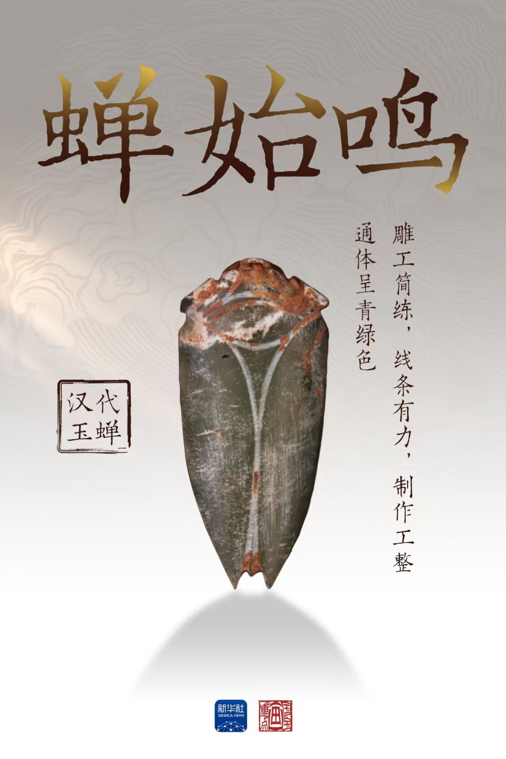 這件漢代玉蟬通體呈青綠色,盛夏的氣息撲面而來?!抖Y記·月令》記載:“仲夏之月,蟬始鳴”,古人發(fā)現(xiàn)夏至之日陽氣達到極盛,蟄伏地底多年的蟬若蟲會破土羽化宣告盛夏來臨,這是自然界的昆蟲“節(jié)氣預(yù)報”。