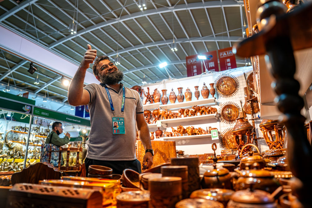 6月21日,第9屆中國(guó)—南亞博覽會(huì)南亞館巴基斯坦展區(qū)的參展商對(duì)觀眾比出大拇指。