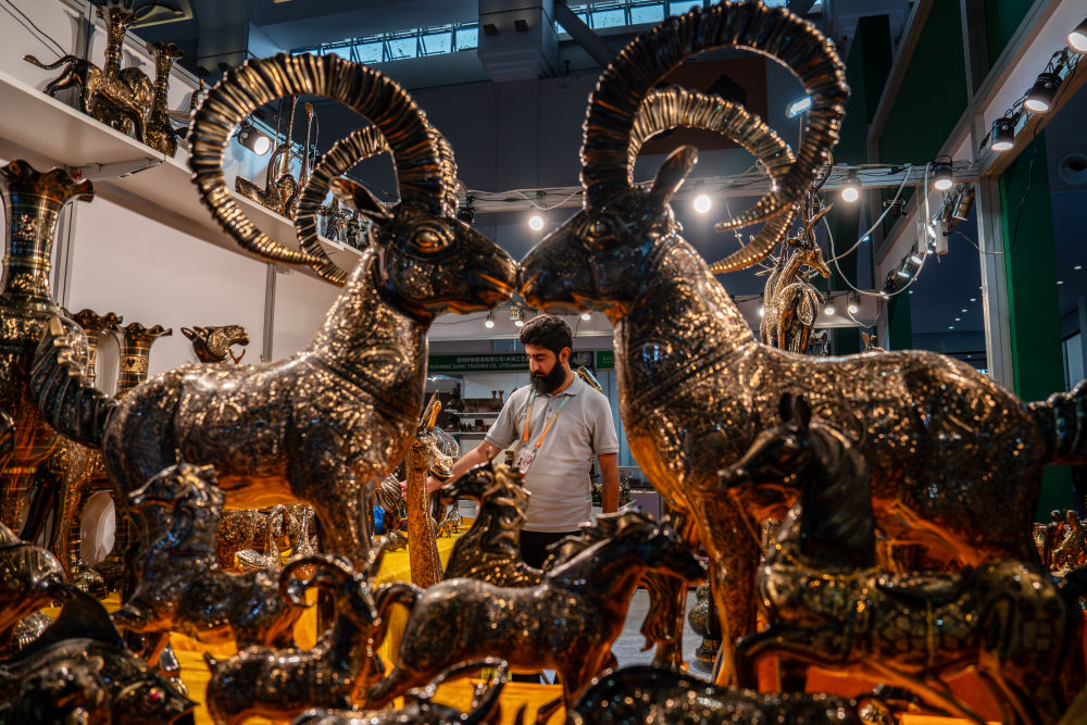 6月20日,顧客在南亞館巴基斯坦展區(qū)選購(gòu)銅制工藝品。