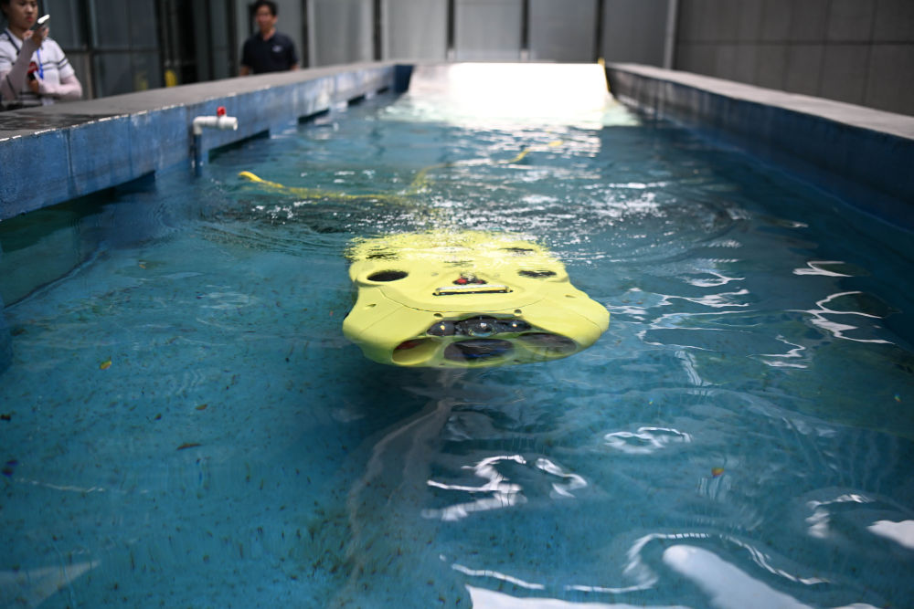 在長方形的測試水池里,一臺明黃色的“鐵疙瘩”時而浮出水面,時而沉入水底,看似笨重的身軀卻靈活得仿佛一條游動的魚。這款用于水下檢測的智能機(jī)器人,可以在“一沉一浮”間實(shí)現(xiàn)對水下情況全方位、無死角的探測作業(yè)。