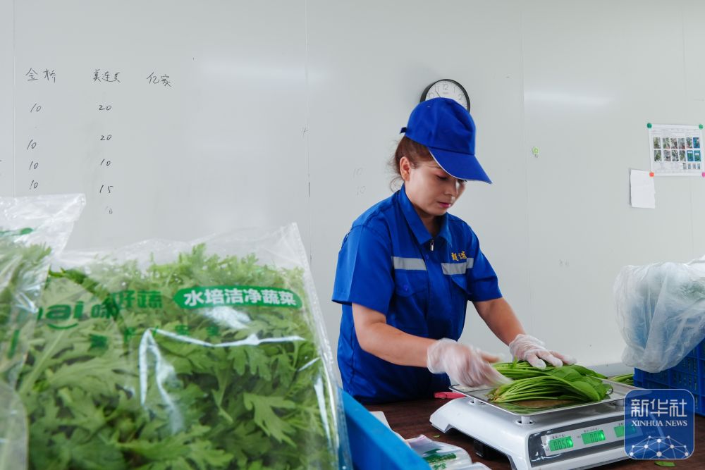 ↑ 6月25日,在新疆阿克蘇地區(qū)庫(kù)車市甬庫(kù)同心村智慧農(nóng)業(yè)植物工廠,工作人員對(duì)收獲的農(nóng)作物進(jìn)行稱重打包。
