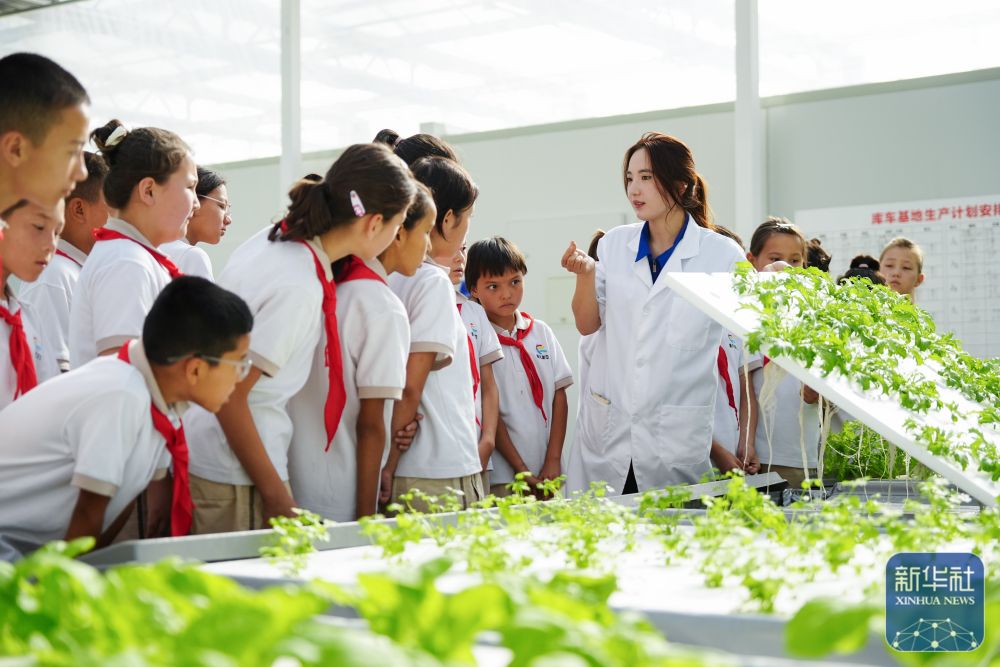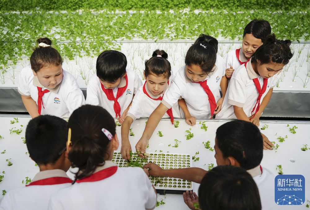 ↑ 6月25日,在新疆阿克蘇地區(qū)庫(kù)車市甬庫(kù)同心村智慧農(nóng)業(yè)植物工廠,當(dāng)?shù)匦W(xué)生體驗(yàn)無土栽培。