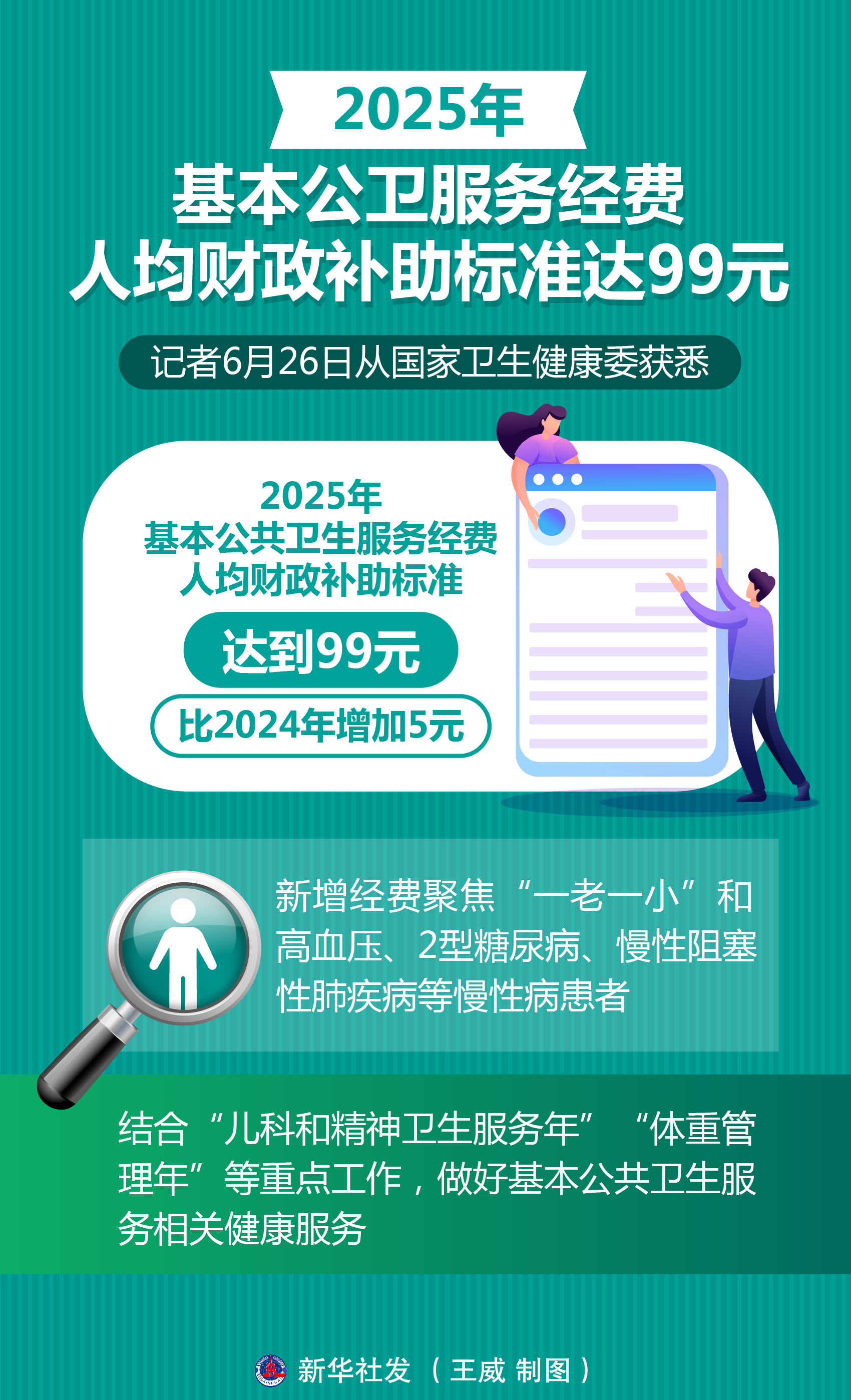 記者26日從國家衛(wèi)生健康委獲悉,2025年基本公共衛(wèi)生服務(wù)經(jīng)費人均財政補助標(biāo)準(zhǔn)達(dá)到99元,比上年增加5元。