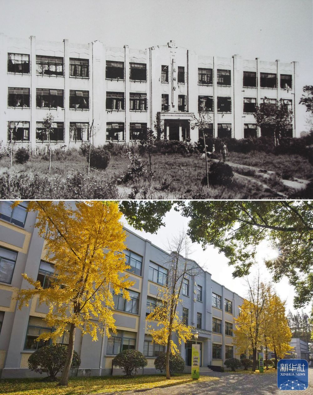 上圖是上海龍華集中營(yíng)的E棟大樓;下圖是上海中學(xué)校園內(nèi)的先棉堂,曾經(jīng)的E棟大樓(資料照片)。新華社發(fā)(上海中學(xué)供圖)