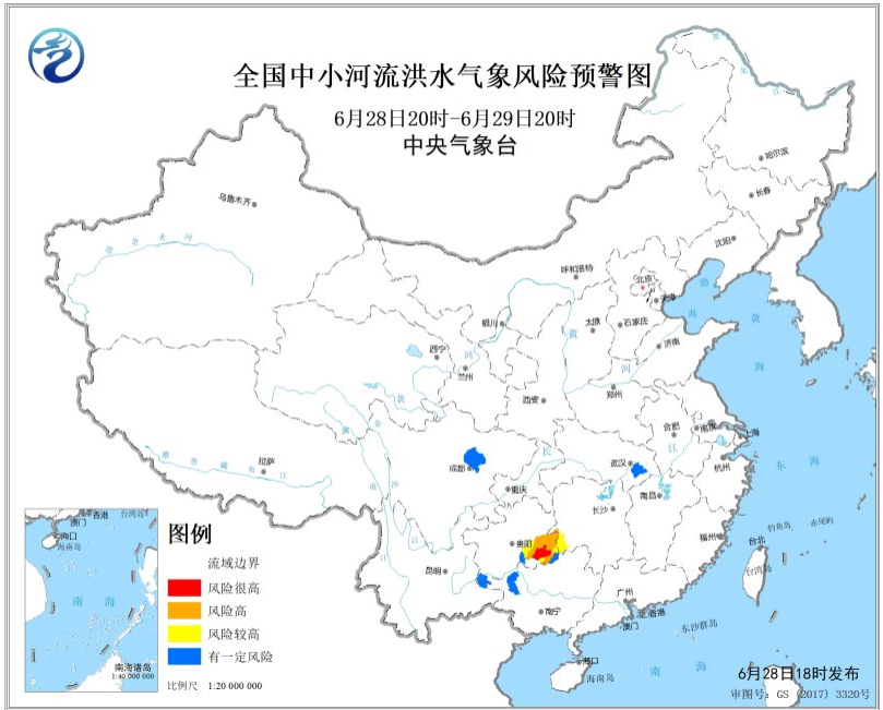 預計,6月28日20時至29日20時,貴州東南部等地部分地區(qū)發(fā)生中小河流洪水的氣象風險高(橙色預警),其中,貴州東南部局地發(fā)生中小河流洪水的氣象風險很高(紅色預警)。請各地密切注意降水引發(fā)的中小河流洪水,并做好實時監(jiān)測、防汛預警和轉(zhuǎn)移避險等防范工作。