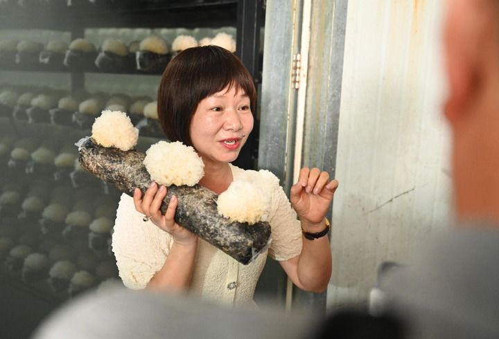 6月26日,寧德晟農(nóng)農(nóng)業(yè)開發(fā)有限公司總經(jīng)理張家巧在介紹智慧菇房生長的古田銀耳。