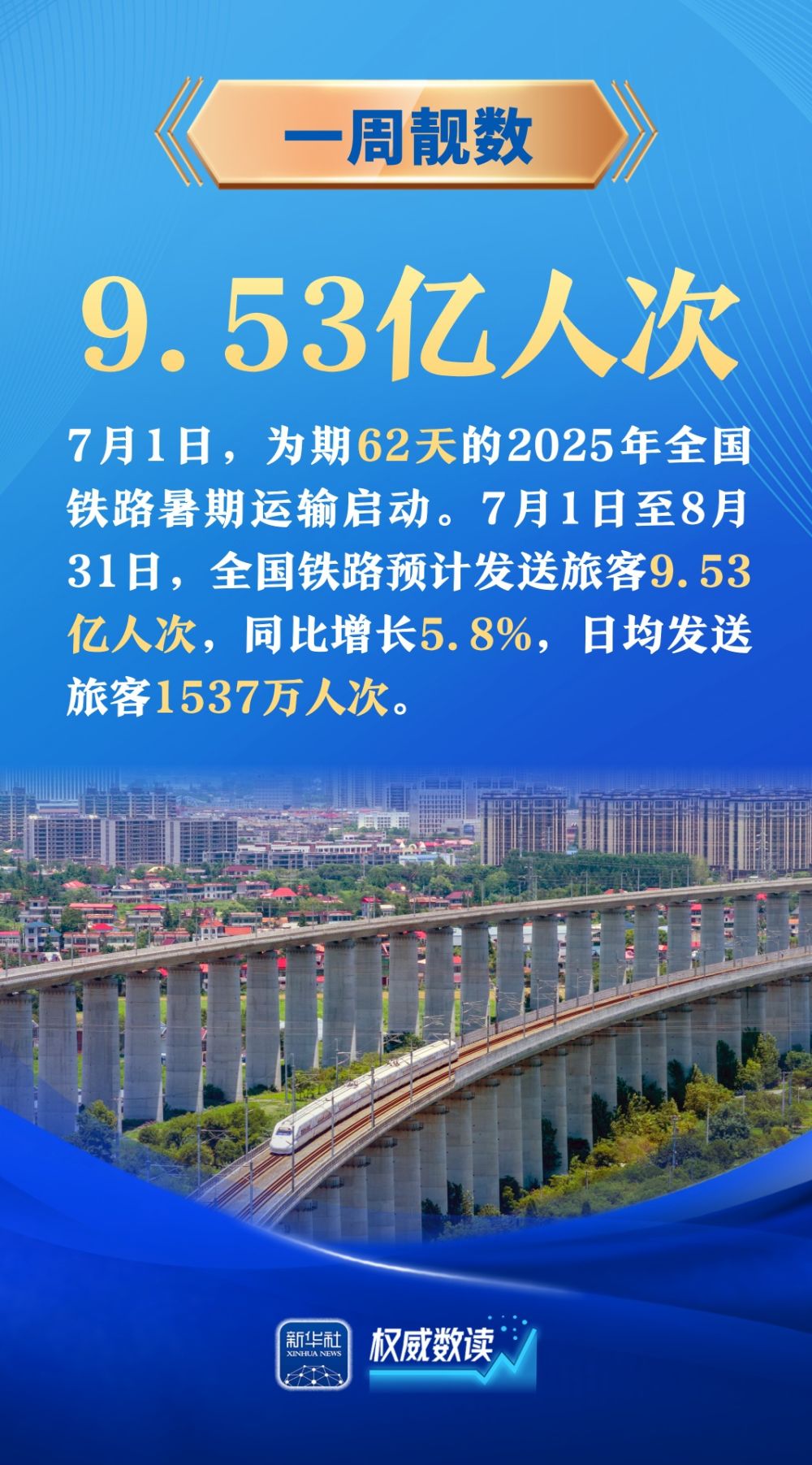 今年“暑運(yùn)”期間全國鐵路預(yù)計(jì)發(fā)送旅客9.53億人次;今年8000億元“兩重”建設(shè)項(xiàng)目清單已全部下達(dá)完畢;前5個月我國規(guī)上互聯(lián)網(wǎng)企業(yè)完成互聯(lián)網(wǎng)業(yè)務(wù)收入7735億元……本周這些“靚”數(shù),值得關(guān)注。