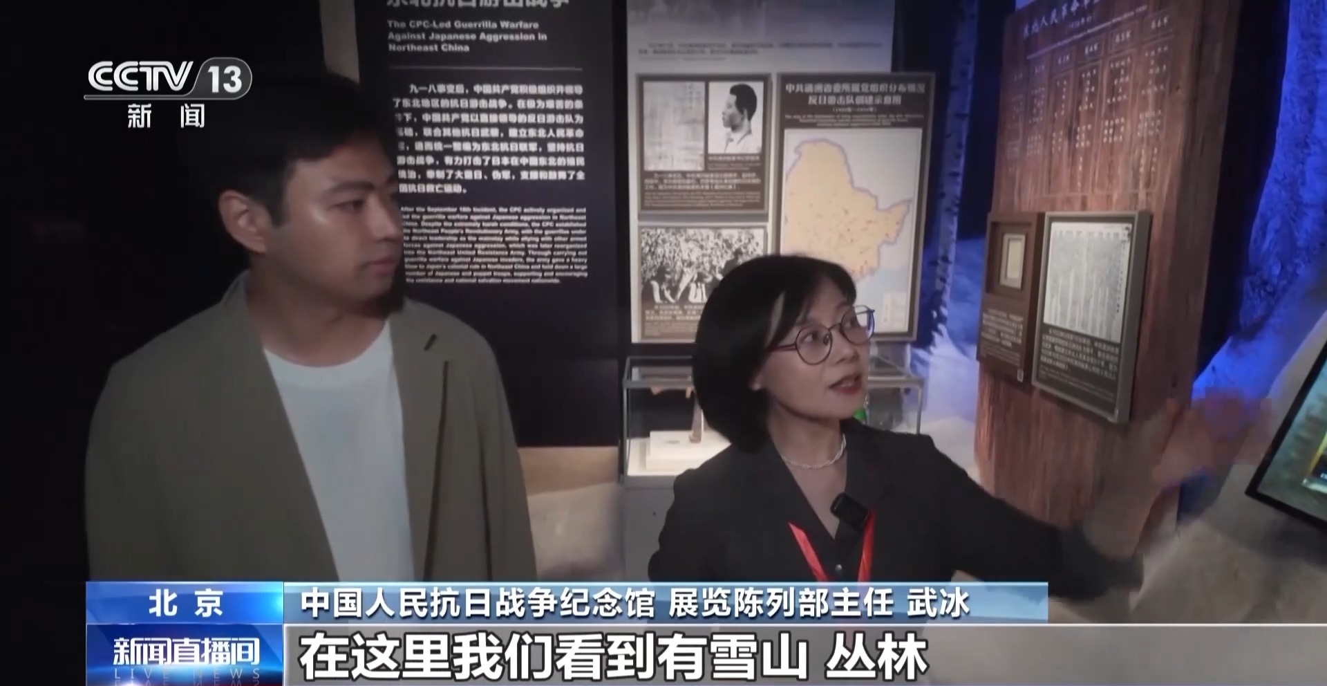 中國(guó)人民抗日戰(zhàn)爭(zhēng)紀(jì)念館 展覽陳列部主任 武冰:現(xiàn)在我們來到的這個(gè)空間就是東北抗聯(lián),在這里我們看到有雪山、叢林,在這里還增加了松樹的樹種,圖片、文物全部放置在了雪山當(dāng)中。觀眾在行進(jìn)過程當(dāng)中,會(huì)有一種破雪前行、歷史畫面慢慢地呈現(xiàn)出來的感受。像這樣的綜合性的景觀打造,在整個(gè)展覽當(dāng)中大概有十余處。