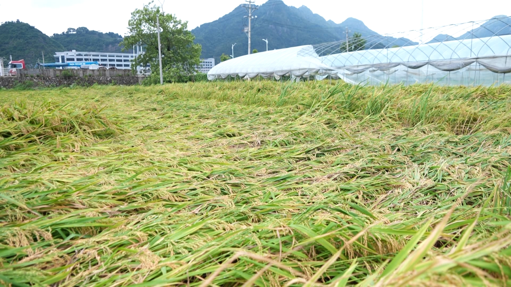 現(xiàn)場,大棚倒塌、薄膜被吹翻,成片的成熟早稻貼伏在地面。種植戶周永乾踩著泥濘,忙不迭給稻田排水,滿臉焦急?!敖衲觊L勢比前幾年都好,平均畝產(chǎn)一千斤以上,開始都高興的很,沒想到快收割的時(shí)候刮臺(tái)風(fēng)。我們一夜都沒睡,在家里睡不著,現(xiàn)在只剩下山邊的四十來畝稻子,其他的都倒平了?!?/p>