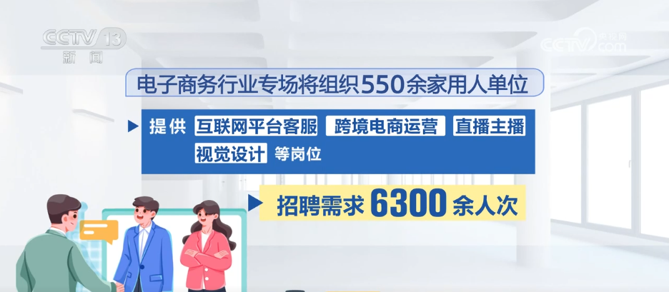 電子商務(wù)行業(yè)專場(chǎng)將組織550余家用人單位,提供互聯(lián)網(wǎng)平臺(tái)客服、跨境電商運(yùn)營(yíng)、直播主播、視覺設(shè)計(jì)等崗位,招聘需求6300余人次。