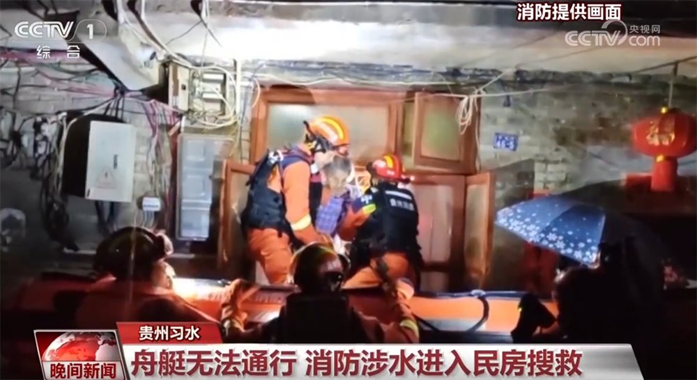 8日晚到9日清晨,貴州遵義習(xí)水縣遭遇強降雨襲擊,導(dǎo)致縣城多處低洼地帶積水嚴重,道路被淹、房屋進水,多名群眾被困。當(dāng)?shù)叵啦块T展開救援,但因部分地區(qū)通道狹窄,舟艇無法通行,消防人員將繩索系在身上,涉水進入民房展開搜救。
