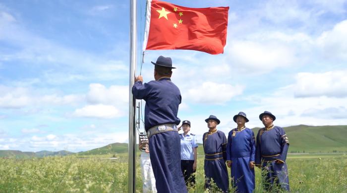 科右前旗守望草原巡防隊(duì)滿(mǎn)族屯分隊(duì)舉行升旗儀式。蔣豪文 攝