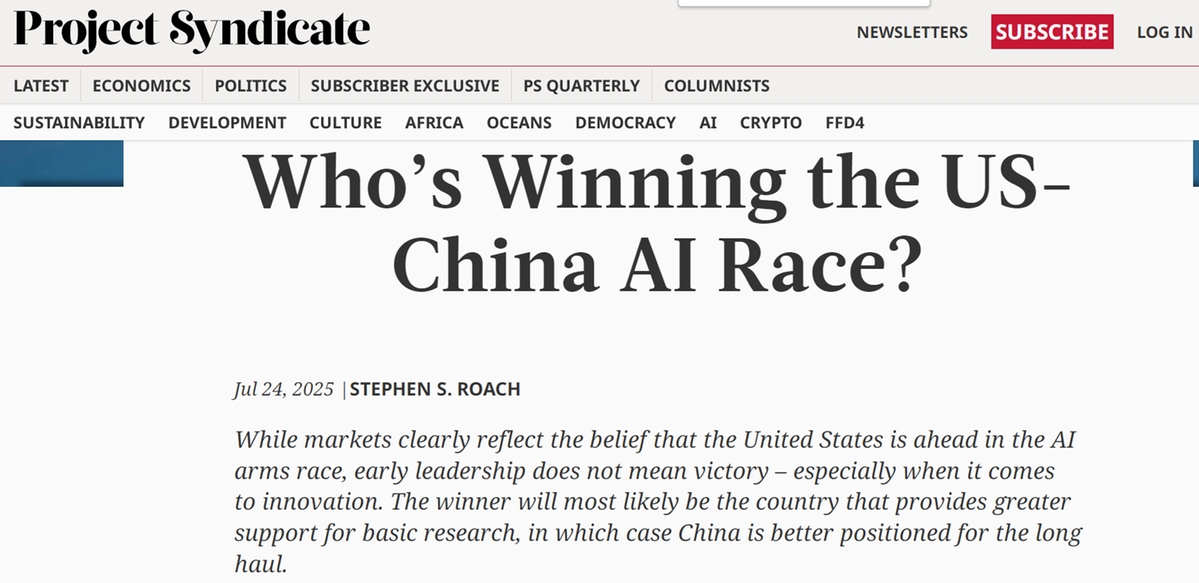 美國摩根士丹利亞洲區(qū)前主席斯蒂芬·羅奇在報業(yè)辛迪加網(wǎng)站(Project Syndicate)發(fā)表文章指出,全球人工智能(AI)競賽的勝負(fù)取決于基礎(chǔ)研究的投入,而非短期市場表現(xiàn)。羅奇認(rèn)為,中國憑借產(chǎn)業(yè)生態(tài)、研發(fā)投入和文化傳統(tǒng),使其在長期競爭中占據(jù)優(yōu)勢。