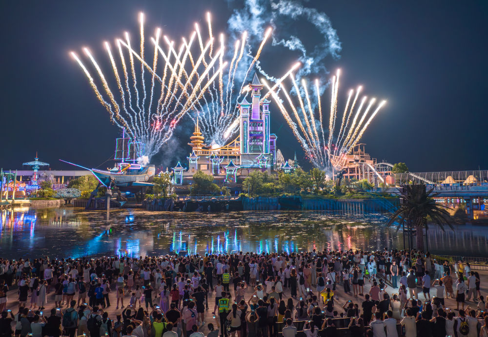 7月19日,在湖北省襄陽市華僑城奇幻谷,游客觀看大型夜間演藝秀《奇幻城堡光影秀》(無人機(jī)照片)。新華社發(fā)(楊東 攝)