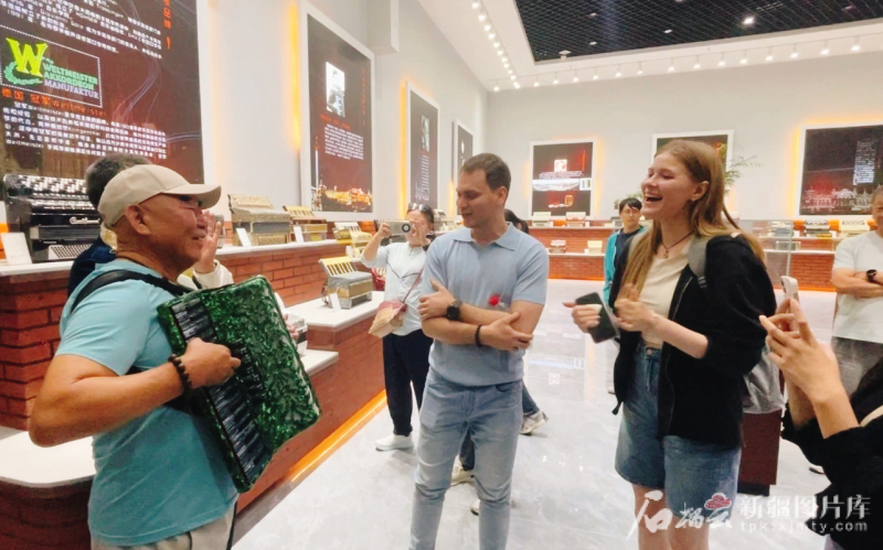 在手風(fēng)琴文化展示廳,面對來自俄羅斯、德國等10多個(gè)國家的1000余架手風(fēng)琴,留學(xué)生們紛紛用鏡頭記錄。當(dāng)了解到塔城已舉辦四屆國際手風(fēng)琴文化藝術(shù)節(jié),享有“中國手風(fēng)琴之城”的美譽(yù),并創(chuàng)造了世界最大規(guī)模手風(fēng)琴合奏吉尼斯世界紀(jì)錄時(shí),現(xiàn)場贊嘆聲不斷。