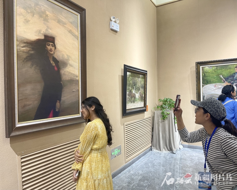 8月2日,北京大學(xué)留學(xué)生在油畫作品前打卡拍照。石榴云/新疆日報(bào)記者 趙西婭攝