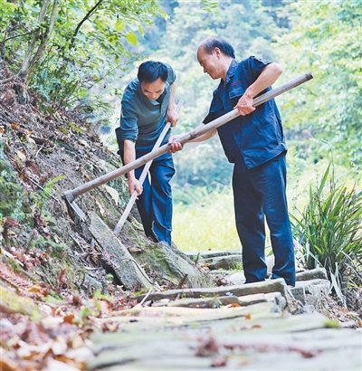 每次上山修路,陳興海和弟弟陳興合都會(huì)帶上鐵鍬、鎬頭、鋤頭、斧頭?!笆^硬得很,我一鎬頭下去,手震得疼!”這樣的日子,兄弟倆一過就是8年。總長(zhǎng)約15公里的古道,已經(jīng)修好了約2/3?!拔覀冞€要繼續(xù)往下修。”陳興海說。