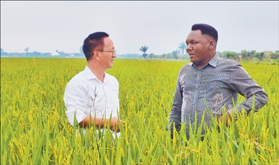 楊華德(左)在田間向當(dāng)?shù)胤N植戶講解水稻種植技術(shù)。本報(bào)記者 黃培昭攝