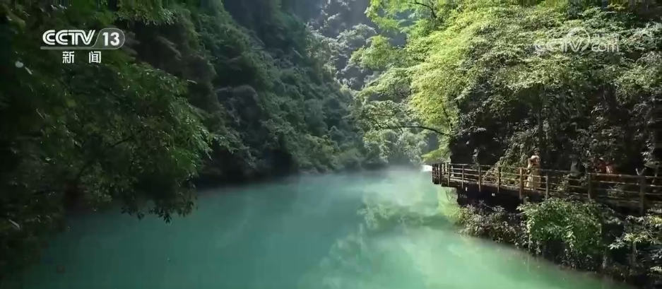 在大峽谷谷底,形態(tài)各異的峰林與緩緩流淌的溪水構(gòu)成了天然畫卷,陣陣微涼的山風(fēng)吹來(lái),游客們仿佛漫步在原始森林中,在喧囂的夏天中感受到了一份難得的靜謐和涼爽。