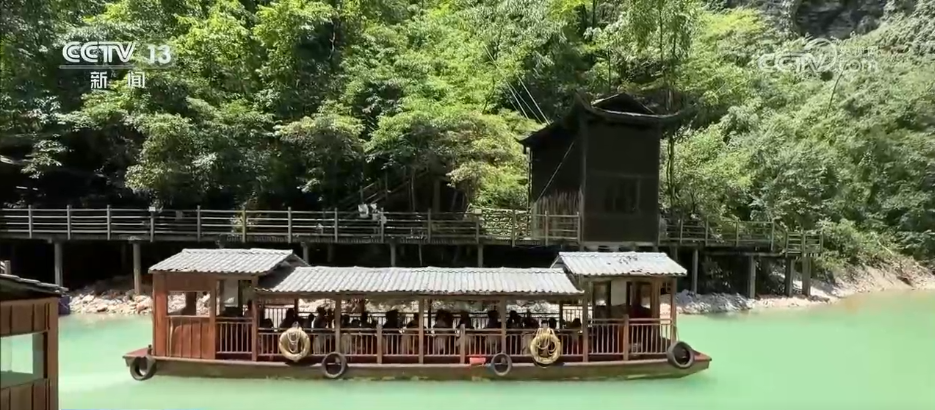 乘船賞景也成為景區(qū)一大特色,游客們乘坐游船緩緩穿梭于澄澈的湖面上,四周峽谷青山環(huán)抱,石壁瀑布傾瀉而下,兩岸景色蔚為壯觀。微風(fēng)拂來(lái),吹散夏日的燥熱,讓人沉浸在如詩(shī)如畫的美景中,心曠神怡。