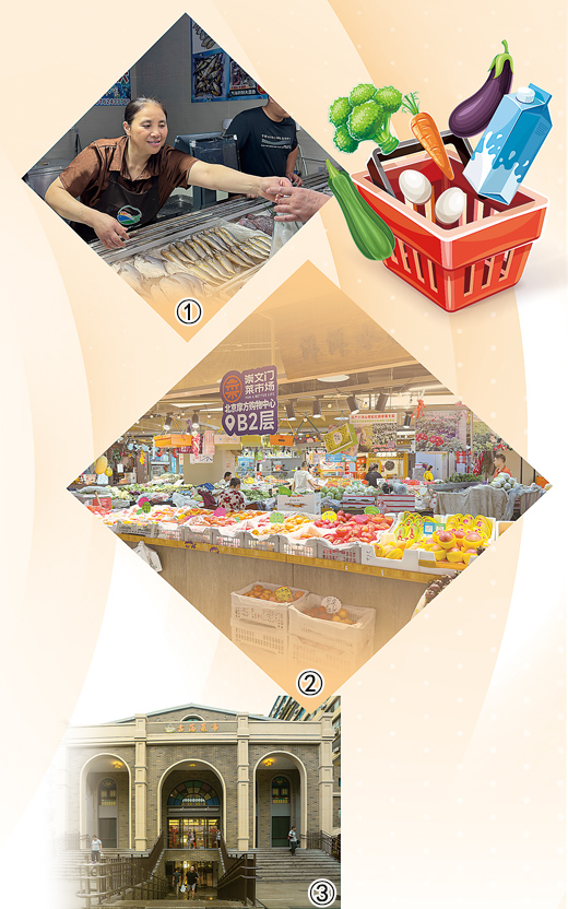 圖②:位于合景·摩方購(gòu)物中心內(nèi)的新崇文門菜市場(chǎng),貨架上各類水果、蔬菜琳瑯滿目。本報(bào)記者 李君強(qiáng)攝