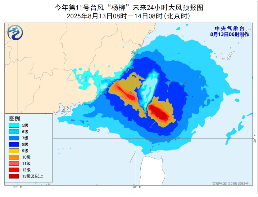 大風預報:8月13日08時至14日08時,東海南部、臺灣以東洋面、南海東北部、巴士海峽、臺灣海峽、臺灣島北部及其沿海、福建北部沿海、廣東中東部沿海將有6~8級大風,臺灣島南部及其沿海、福建中南部沿海、臺灣東南洋面、臺灣海峽和巴士海峽的部分海域風力可達9~10級,臺風中心經(jīng)過的附近海域和地區(qū)風力有11~14級,陣風15-16級。