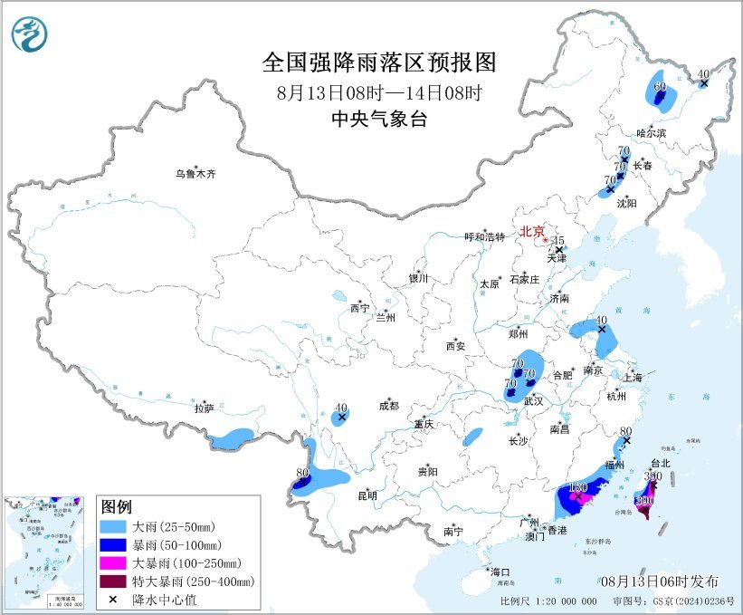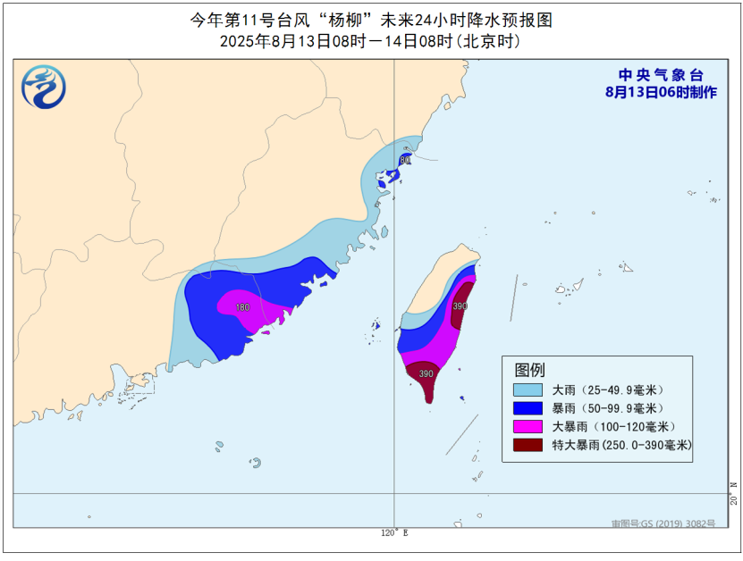 降水預報:8月13日08時至14日08時,廣東東部、福建東部和南部、臺灣島大部等地有大到暴雨,其中,福建東南部、廣東東南部、臺灣島東部和南部等地有大暴雨,臺灣島東部和南部的局地特大暴雨(250~390毫米)。