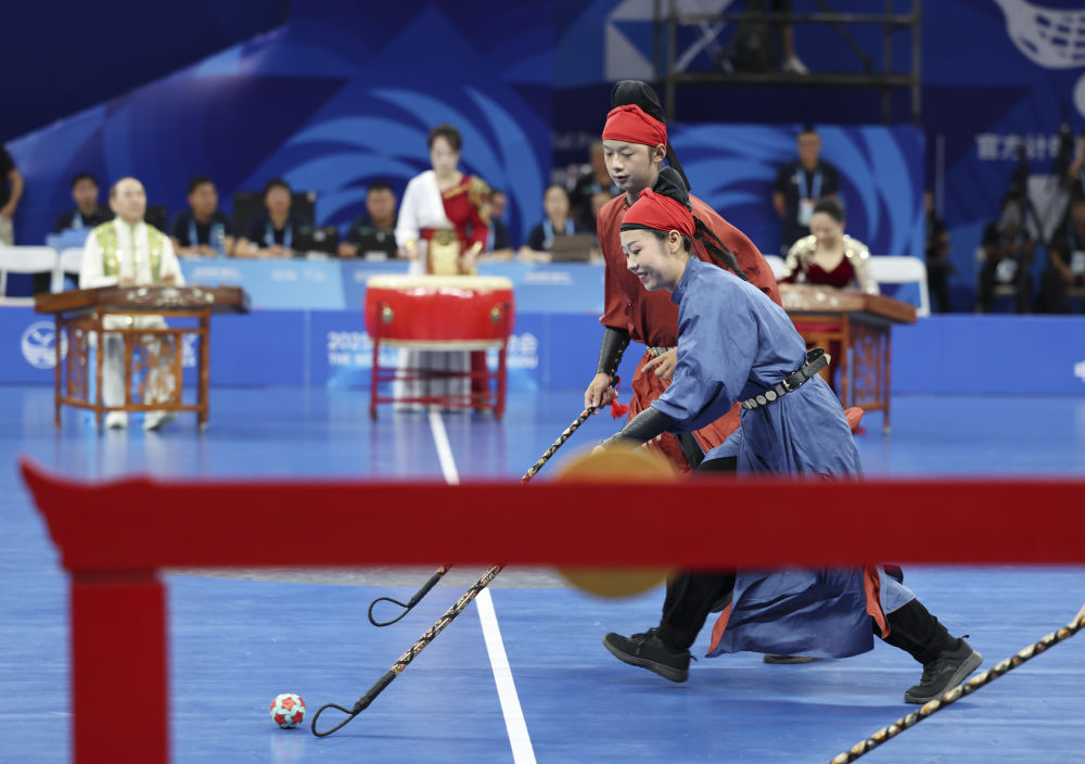 世運(yùn)會不僅是競技的賽場,更是文明互鑒的窗口。8月6日,軟式曲棍球項目開賽。正式比賽之前,一場別開生面的“比賽”率先上演。循著鼓點(diǎn)、琴聲,演員們身著唐裝球衣競逐竹編彩球,一場金堂非遺步打球表演,將現(xiàn)場觀眾帶回到盛唐場景。