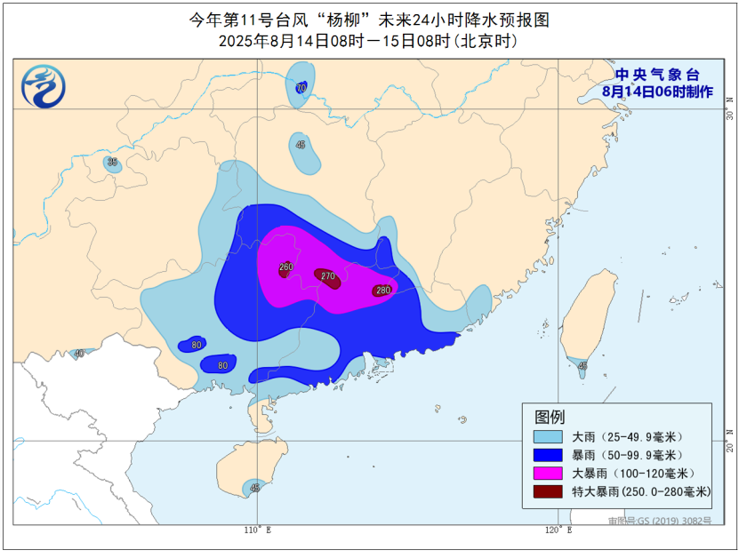預(yù)計(jì),8月14日08時(shí)至15日08時(shí),廣東大部、廣西大部、福建東南部、江西南部、湖南中南部和西北部、貴州東部等地有大到暴雨,部分地區(qū)大暴雨,其中,廣東北部、廣西東北部、湖南南部、江西西南部等地局地有特大暴雨(250~280毫米)。上述部分地區(qū)伴有短時(shí)強(qiáng)降水(最大小時(shí)降雨量20~50毫米,局地可超過(guò)70毫米),局地有雷暴大風(fēng)等強(qiáng)對(duì)流天氣。