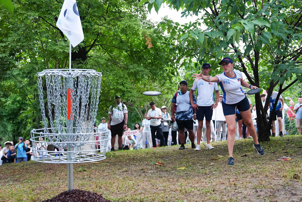 8月10日,美國擲準飛盤選手甘農(nóng)(前)在比賽中。新華社記者 陳欣波 攝