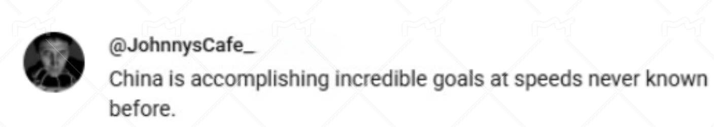 網(wǎng)友@JohnnysCafe_表示,“中國(guó)正在以前所未有的速度實(shí)現(xiàn)令人難以置信的目標(biāo)?!?/p>