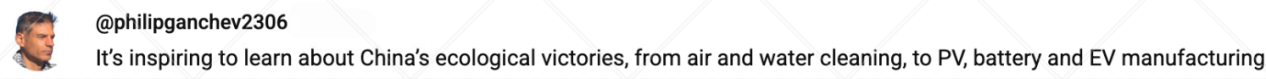 網(wǎng)友@philipganchev2306表示,“從空氣和水凈化到光伏、電池和電動(dòng)汽車制造,了解中國(guó)在生態(tài)領(lǐng)域取得的成就令人鼓舞?!?/p>