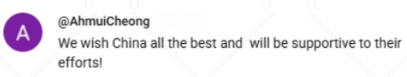 網(wǎng)友@Ahmuicheong祝愿道,“祝愿中國(guó)一切順利,支持他們的努力!”