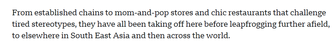 文章說,中國(guó)烹飪技藝源遠(yuǎn)流長(zhǎng)、博大精深,一桌美食盛宴或許正是中國(guó)最有效卻又最被低估的吸引力所在。還是以新加坡為例,商場(chǎng)、公交和地鐵站里,搭配著中國(guó)成語(yǔ)的中國(guó)美食巨幅亮眼廣告不時(shí)閃現(xiàn)。從連鎖巨頭到夫妻小店,再到顛覆刻板印象的時(shí)尚餐廳,這些中國(guó)美食品牌在向東南亞乃至全球擴(kuò)張前,都已在這個(gè)國(guó)際旅游城市嶄露頭角。