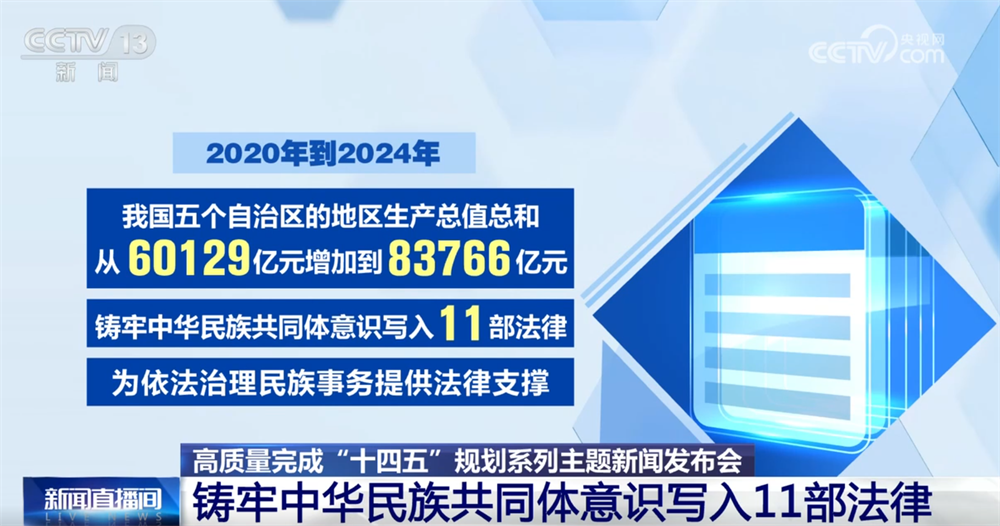 據(jù)了解,2020年到2024年,我國(guó)五個(gè)自治區(qū)的地區(qū)生產(chǎn)總值總和從60129億元增加到83766億元。鑄牢中華民族共同體意識(shí)寫入11部法律,為依法治理民族事務(wù)提供法律支撐。