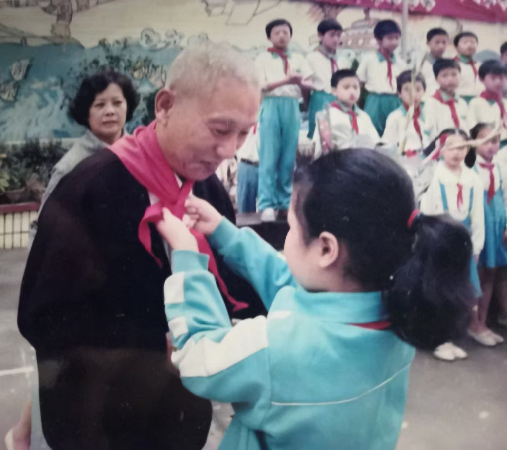 ↑在鄱陽街小學(xué)演講活動期間,學(xué)生為李德富系紅領(lǐng)巾