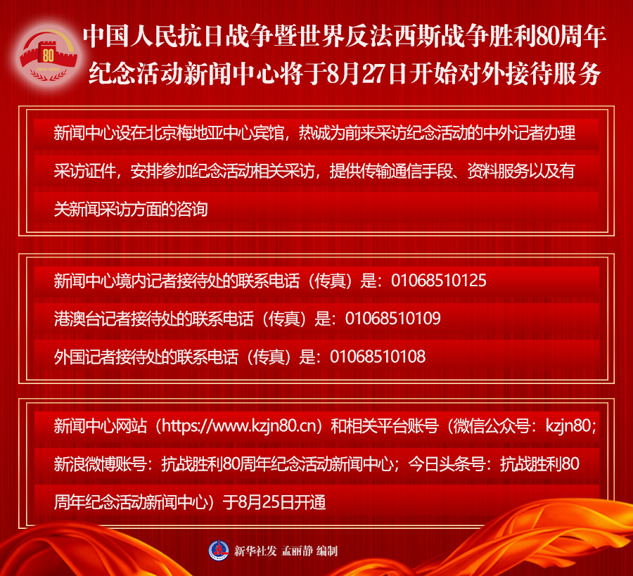 新聞中心網(wǎng)站(https://www.kzjn80.cn)和相關(guān)平臺(tái)賬號(hào)(微信公眾號(hào):kzjn80;新浪微博賬號(hào):抗戰(zhàn)勝利80周年紀(jì)念活動(dòng)新聞中心;今日頭條號(hào):抗戰(zhàn)勝利80周年紀(jì)念活動(dòng)新聞中心)將于8月25日開(kāi)通。