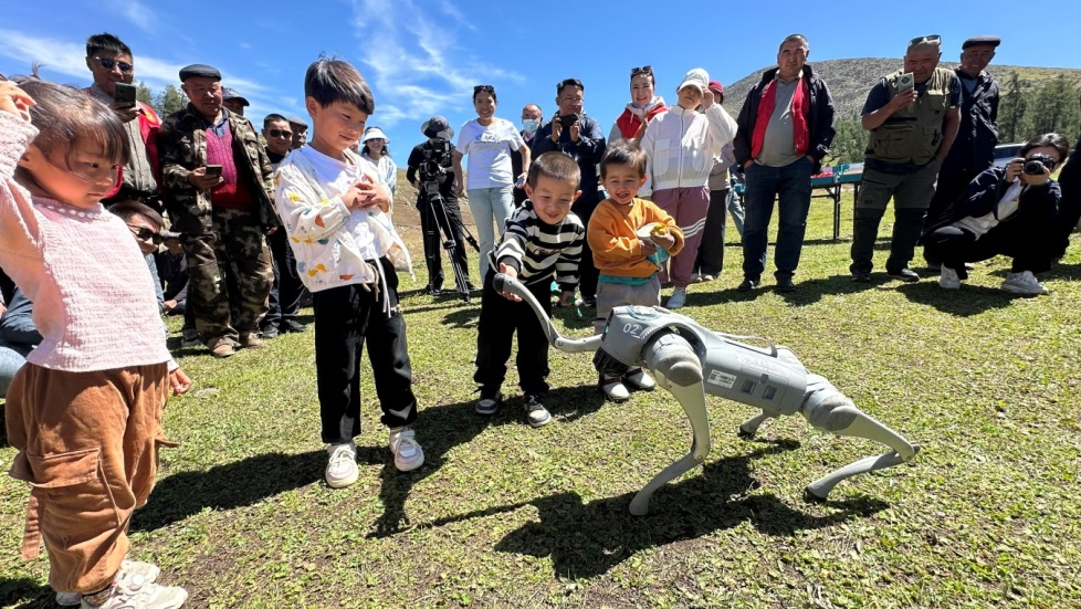 科普大篷車開進(jìn)新疆阿勒泰青河縣套查干湖夏牧場(chǎng),當(dāng)?shù)匦∨笥押蜋C(jī)器狗互動(dòng)。(新疆科技館供圖)