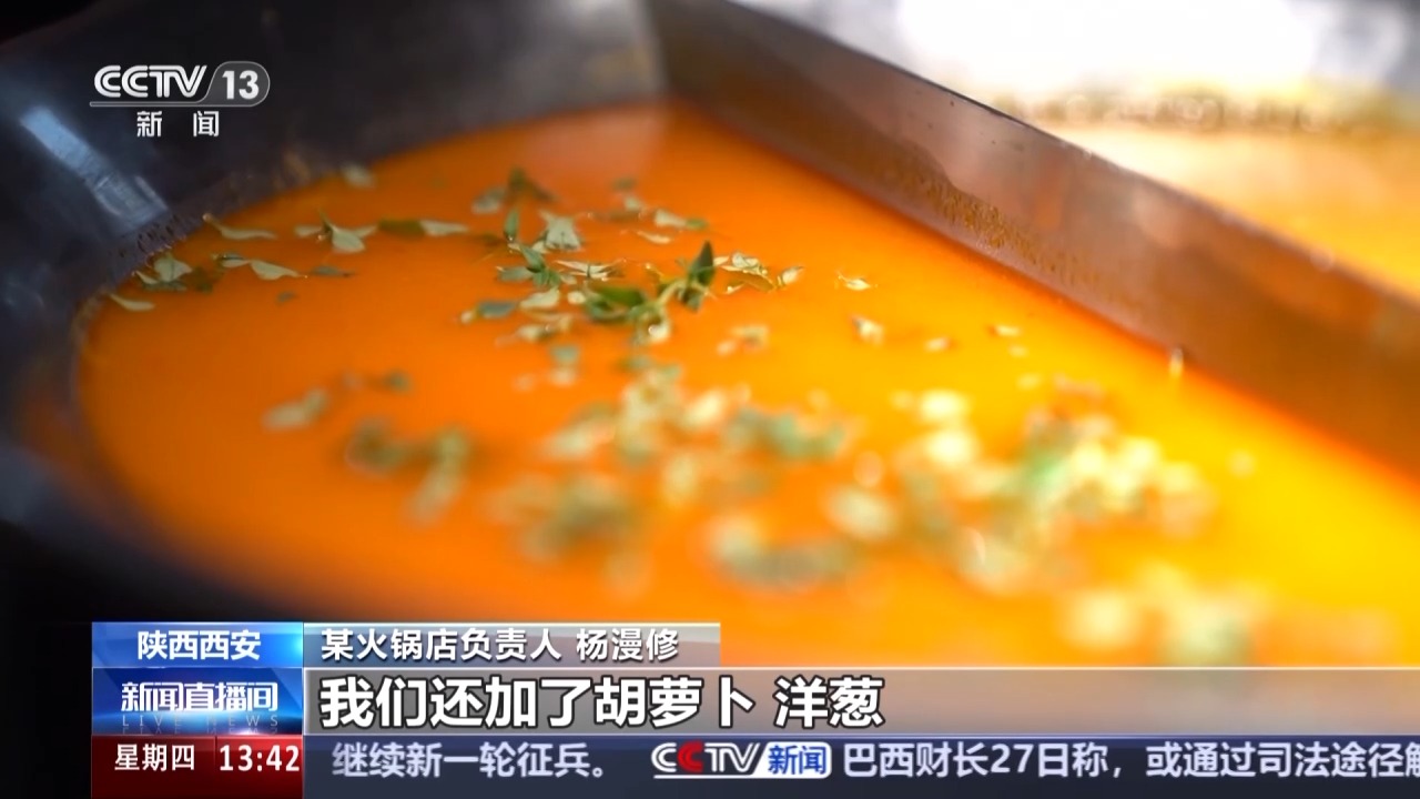 某火鍋店負(fù)責(zé)人 楊漫修:我們這個(gè)番茄鍋更像是西餐里面的番茄濃湯,比如說我們在做料的時(shí)候除了番茄以外,我們還加了胡蘿卜、洋蔥、歐芹、百里香。