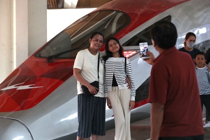 6月19日,在印度尼西亞雅加達哈利姆站站臺,兩名乘客與雅萬高鐵高速動車組列車合影。 新華社記者 岑云鵬 攝