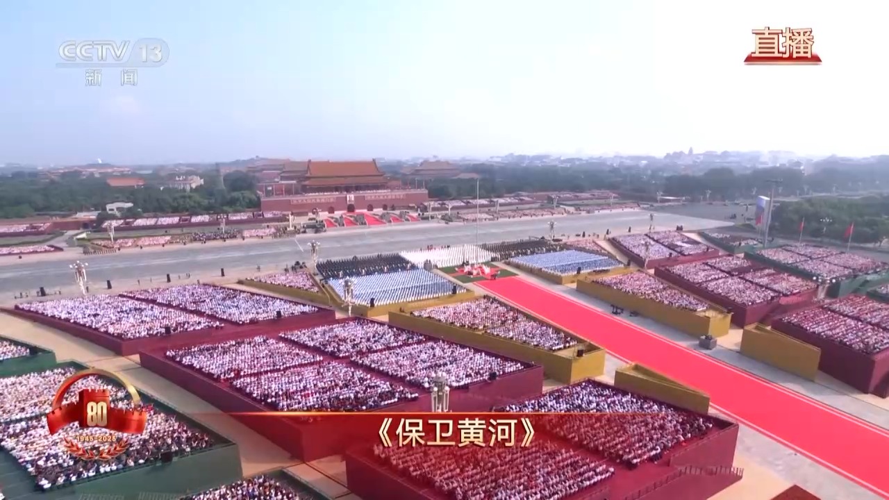 紀(jì)念大會(huì)開始前,天安門廣場(chǎng)上千人軍樂團(tuán)、合唱團(tuán)奏唱抗戰(zhàn)歌曲《保衛(wèi)黃河》。