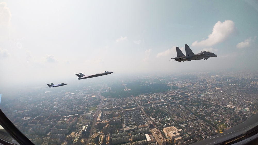 ↑這是殲擊機(jī)梯隊(duì)從北京城區(qū)上空飛過(guò)。