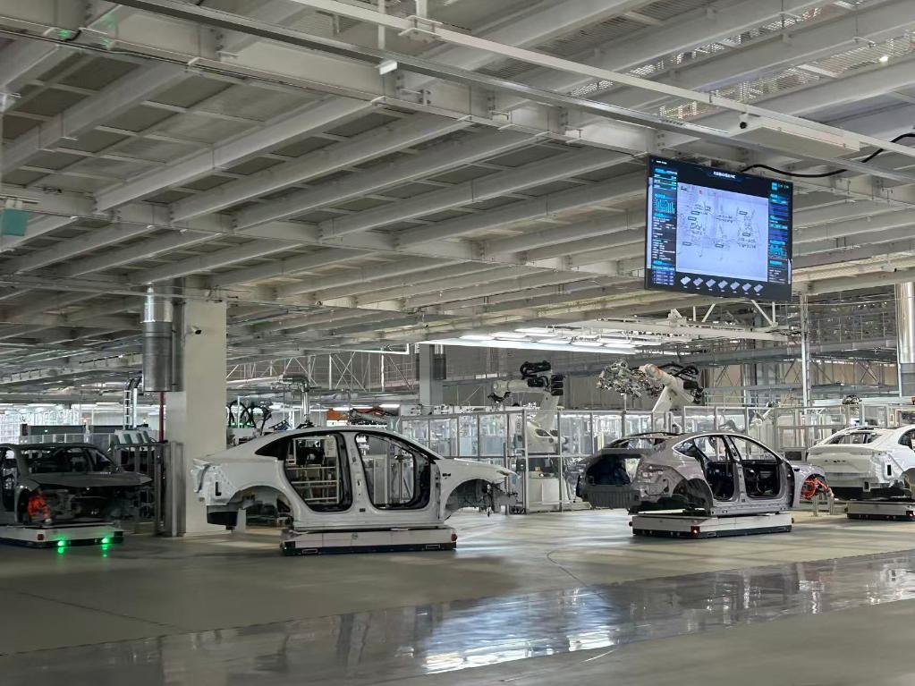 合肥市新橋智能電動(dòng)汽車產(chǎn)業(yè)園蔚來(lái)第二工廠內(nèi)拍攝的新能源汽車生產(chǎn)線。新華社記者吳慧珺 攝