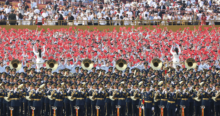 ↑9月3日,紀念中國人民抗日戰(zhàn)爭暨世界反法西斯戰(zhàn)爭勝利80周年大會在北京隆重舉行。這是中國人民解放軍聯(lián)合軍樂團和合唱團。新華社記者 劉衛(wèi)兵 攝