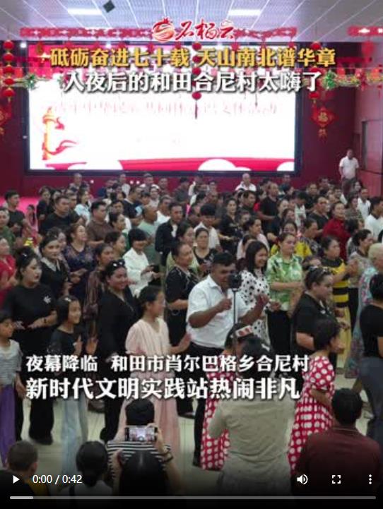 夜幕降臨后,和田市肖爾巴格鄉(xiāng)合尼村新時代文明實踐站熱鬧非凡。村民們自發(fā)編排舞蹈,有的放聲歌唱、有的盡情起舞,紛紛在舞臺上亮出本領(lǐng)、一展風采。精彩的文體活動,為村民送上 “家門口的文化大餐”,既帶來歡聲笑語,也獻上視覺盛宴,更讓大家的生活滿是幸福滋味。
