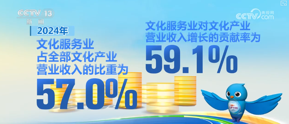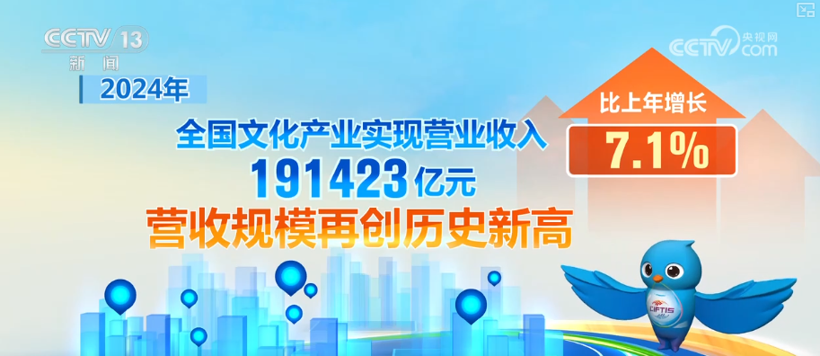 2024年,全國文化產(chǎn)業(yè)實(shí)現(xiàn)營業(yè)收入191423億元,營收規(guī)模再創(chuàng)歷史新高,比上年增長(zhǎng)7.1%。2024年,文化服務(wù)業(yè)實(shí)現(xiàn)營業(yè)收入109134億元,比上年增長(zhǎng)7.4%,占全部文化產(chǎn)業(yè)營業(yè)收入的比重為57.0%,文化服務(wù)業(yè)對(duì)文化產(chǎn)業(yè)營業(yè)收入增長(zhǎng)的貢獻(xiàn)率為59.1%。