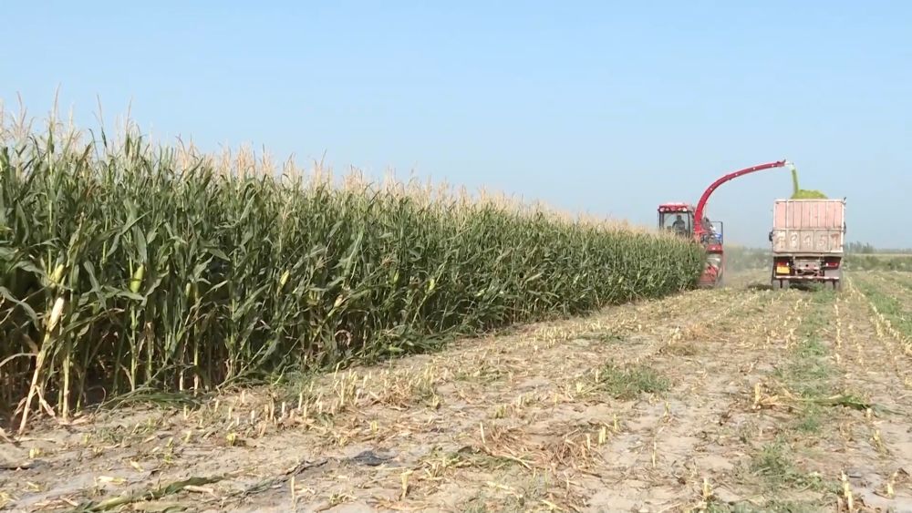 新疆巴音郭楞蒙古自治州焉耆縣的1.5萬(wàn)畝青貯玉米迎來(lái)豐收。在永寧鎮(zhèn)九號(hào)渠村,大型青貯收割加工機(jī)將一株株玉米從根部割斷,粉碎后拋入集草車(chē)。