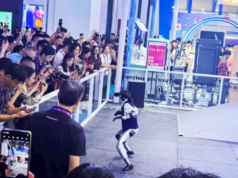 在東博會宇樹科技展位,機器人在表演熱舞。新華社記者王楚然 攝